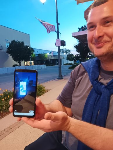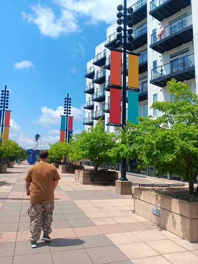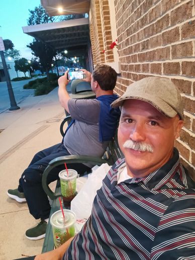 [Pic Above: Christopher the Evening of July 4th, 2025, sitting on a bench in town with me (Iowa), eating and watching the fireworks!]